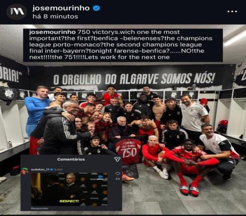 葡萄牙杯第5轮,本菲卡客场2比0轻取葡甲球队法鲁人,穆里尼奥取得执教生涯第750场胜利(1214场,胜率62%)。事后他在社交媒体上发图庆祝,并写道:“750场胜利哪一场最重要?第一场?本菲卡对贝伦人?波尔图对摩纳哥的欧冠决赛?国际米兰对拜仁的第二场欧冠决赛?今天的法鲁人对本菲卡?不!是下一场!第751场!” 本菲卡中场苏达科夫则在评论区回复了一张穆帅“尊重”的名场面表情图。