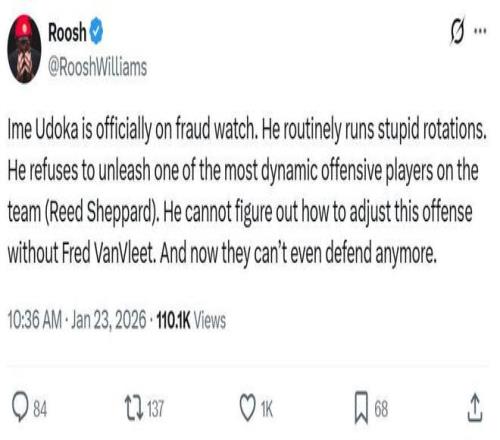 因此火箭播客主持人Roosh Williams在乌度卡给出理由后依旧怒喷到:“乌度卡已经被正式列入欺诈名单,他经常摆出愚蠢的轮转阵容,拒绝让队中最有进攻活力之一的谢泼德登场,没有范乔丹,他根本不知道如何调度进攻,甚至现在连防守也没有了。”