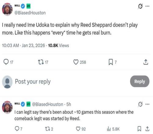 火箭媒体人Will更是发文直接点名乌度卡,表示自己真得需要乌度卡解释一下,为什么谢泼德登场机会这么少,而且每一次都是在其状态火热时发生,火箭队本赛季差不多有8-10场被逆转的比赛是从谢泼德使用出问题开始的。