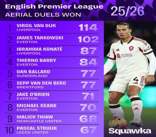 在第23轮战罢后,Squawka统计了本赛季英超赢得空中对抗数据,利物浦中卫范戴克高居榜首,成功率也最高。